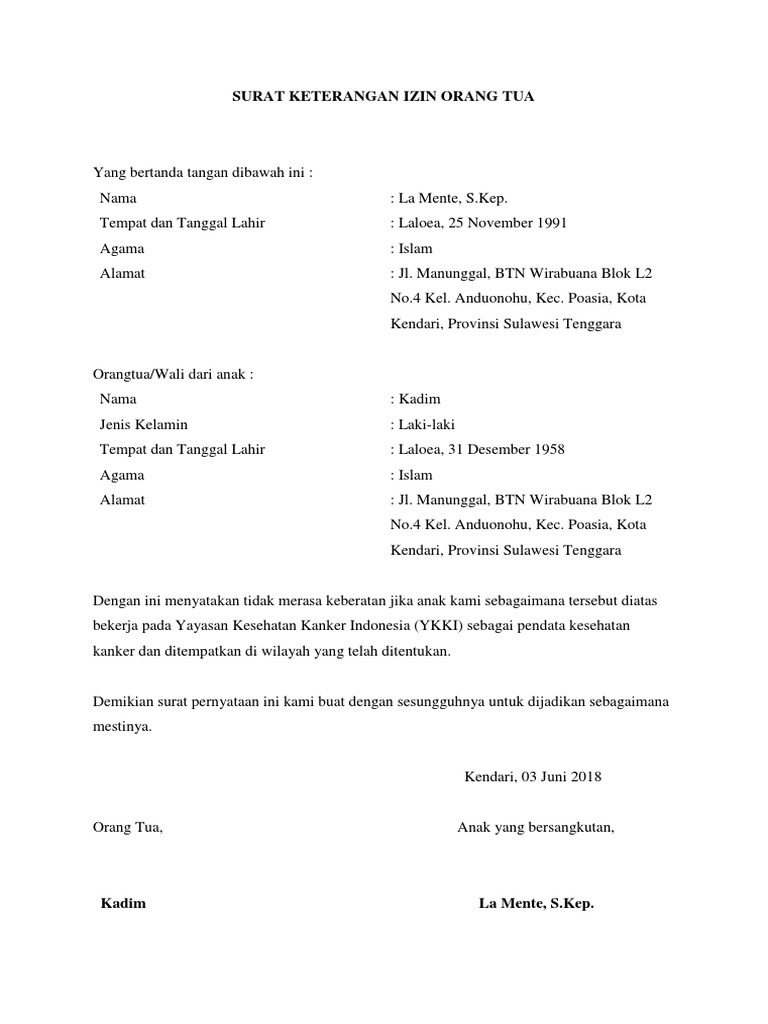 Tapi jangan lupa untuk membuat surat izin. Contoh surat keterangan orang tua. Penutup penutup surat biasanya berisi ucapan terima kasih dan salam penutup. 11 contoh surat keterangan kerja. Surat keterangan izin orangtuauntuk bekerja pada.